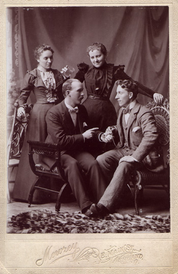 When they say a picture tells a story, I can’t help but think of this one, which appears to be a very happy little polycule having fun for the camera. The gentlemen are holding hands and touching feet while discussing something, and the ladies look on with mischief, tipping glasses of water onto the unwitting gentlemen. It’s a happy photo, regardless of the particulars, and subtly queer, and I hope, wherever it ended up, it’s treasured.