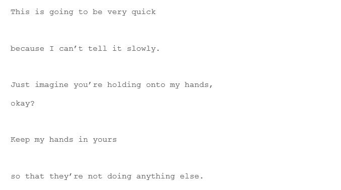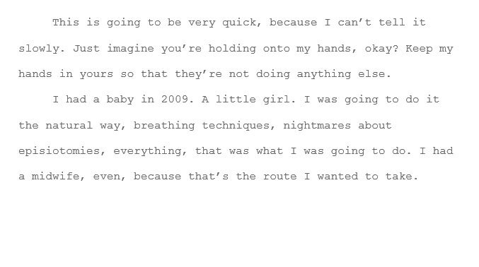 I used my laptop and opened it up to a Word doc of my story. The doc didn’t match my original story, because fiction is largely a visual medium– by which I mean, part of what I think about when I write is how the words, punctuation, and white space looks on the page. Since this was a video performance, though, I instead broke up the text by pauses and emphasis rather than by layout and written grammar. (Insert here rather a lot of talk about the history of punctuation, the invention of silent reading, and the past lives of the paragraph.)